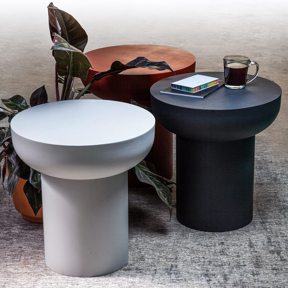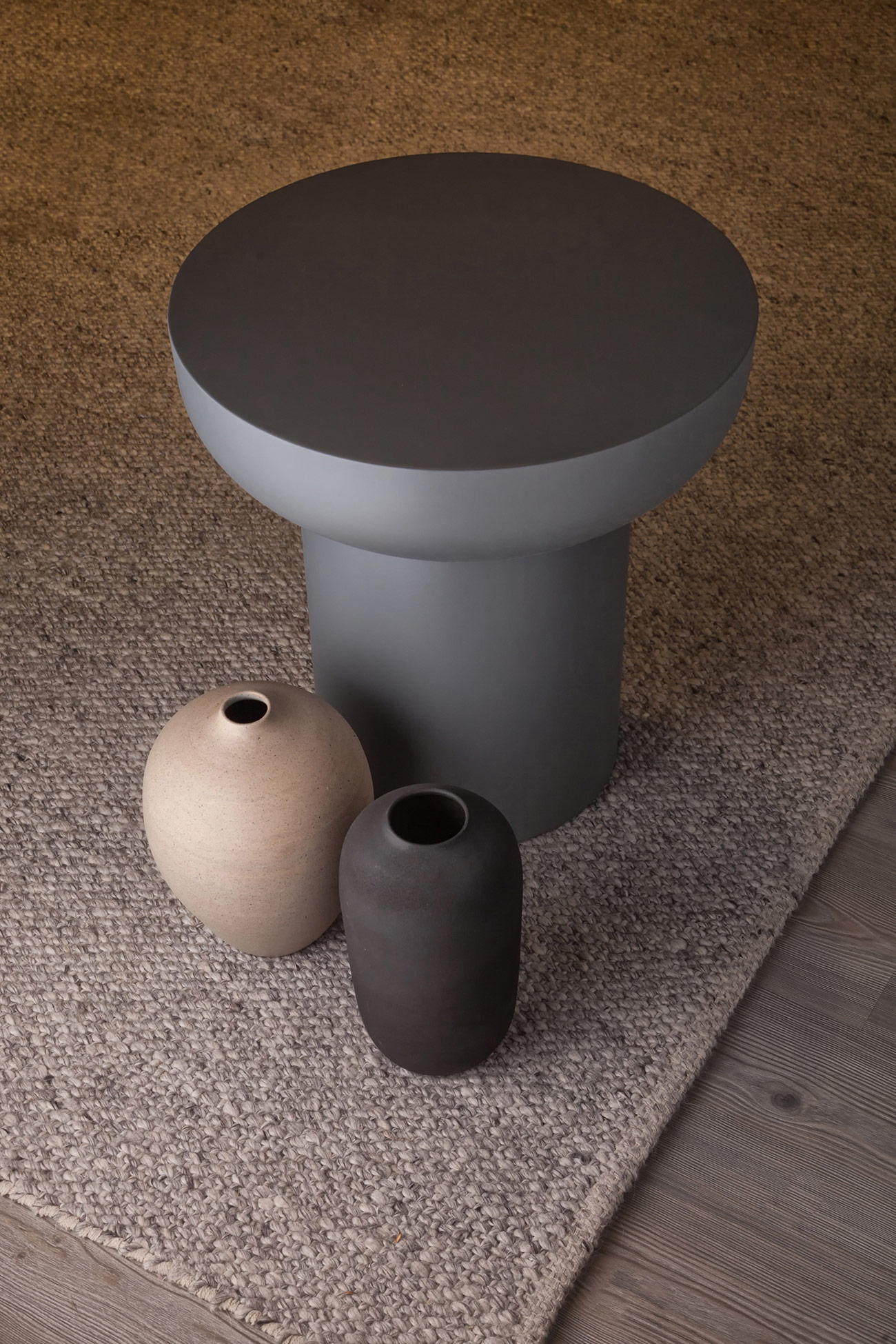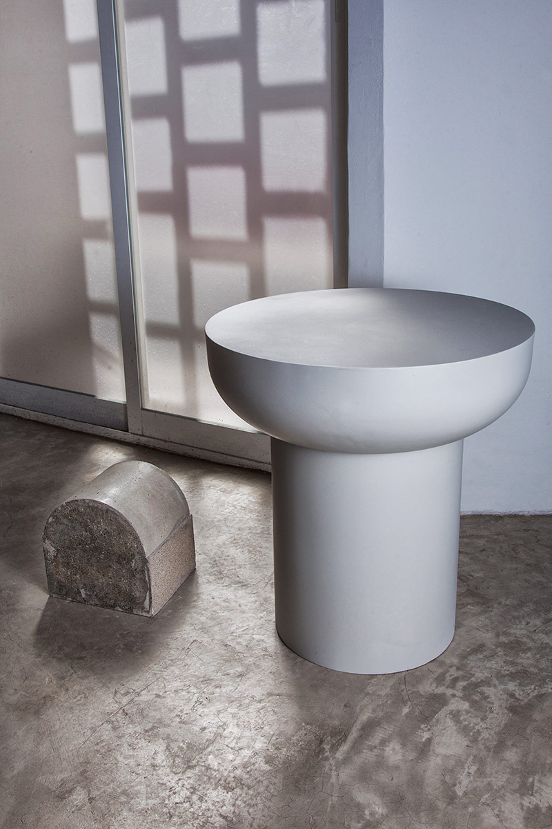 Mesa Sola, la solidez de su base cilíndrica transmite estabilidad, mientras que la suavidad de su cubierta semiesférica sugiere una superficie de soporte cuidadosamente definida, pensada para sostener objetos con precisión y equilibrio.