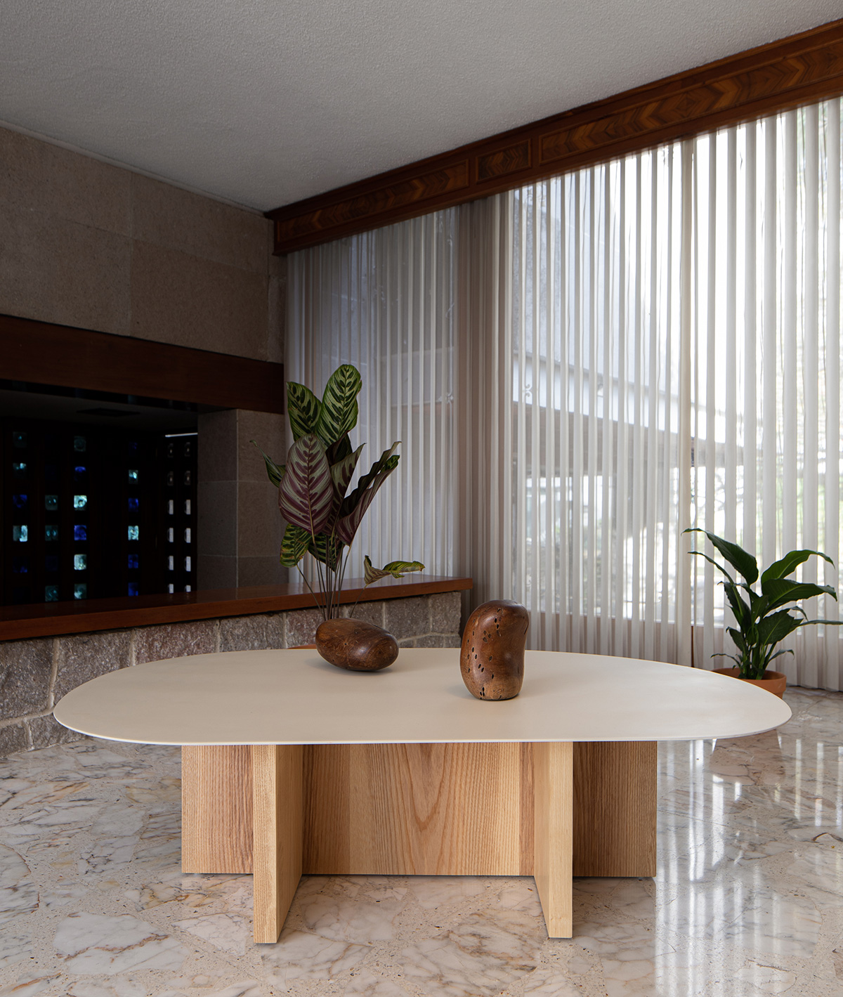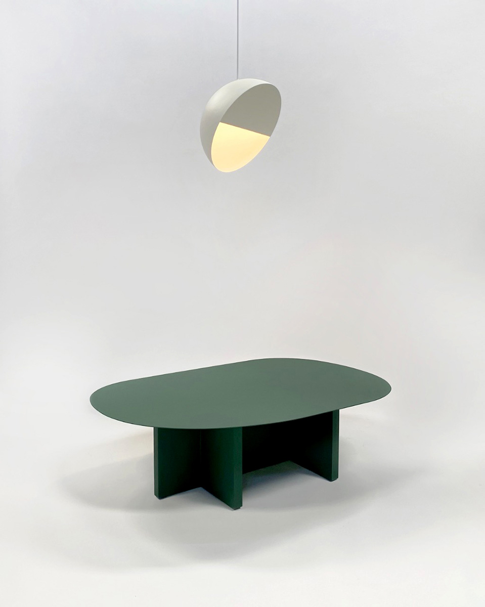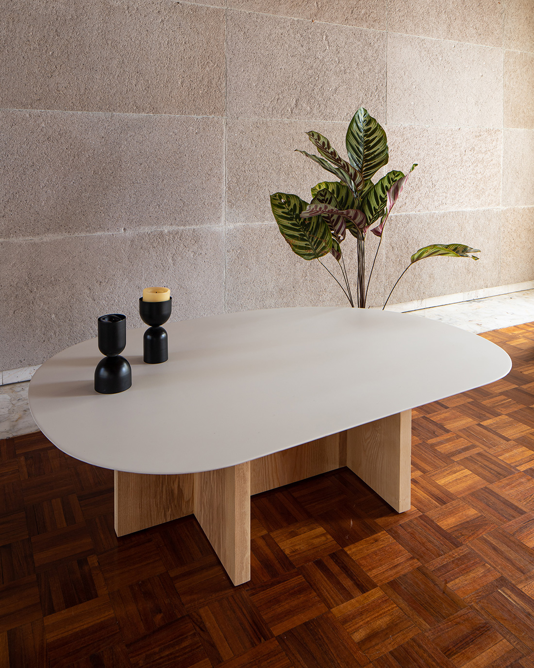 La mesa de centro OVU es una pieza contemporánea que combina líneas orgánicas con una construcción sólida y escultórica. Su cubierta de metal ovalada de bordes suaves descansa sobre una base entrecruzada, logrando un equilibrio entre lo visualmente ligero y lo estructuralmente estable. Disponible en dos versiones de base, madera sólida de fresno o aglomerado con acabado mate.
